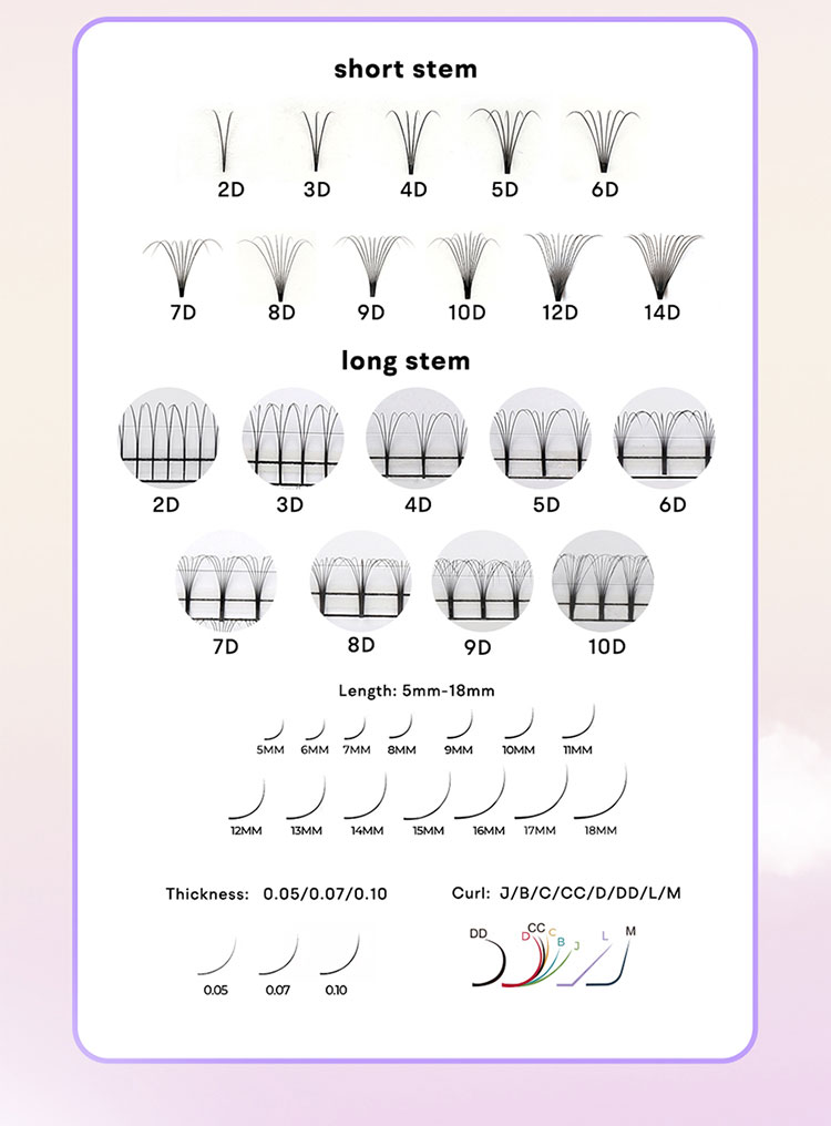 Premade fanúšikovia 8D krátke kmeňové riasy sú vyrobené zo 100% kórejského materiálu PBT, vďaka čomu sú mäkšie, tmavšie a majú široké ventilátory so tenšími tipmi. Tento vynikajúci materiál napodobňuje prírodné riasy a ponúka klientom luxusný a pohodlný zážitok z nosenia, ktorý zvyšuje ich krásu bez nepohodlia.
